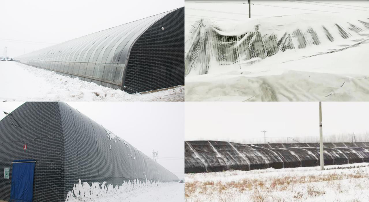 在寒冷的冬季里,若遇到突如襲來的降雪或狂風,北方高寒地區(qū)設施農業(yè)生產將會受到嚴重影響,北方多數溫室因為積雪和狂風導致坍塌,而這時水蓄熱內保溫裝配式日光溫室表現出強勁的使用性能。圖一為水蓄熱內保溫裝配式日光溫室,內保溫被正常卷起,落在溫室棚膜上的積雪自動滑落,不影響設施使用及作物生長。圖二為普通外保溫溫室,外保溫被積雪,不能卷起,設施承重增加,多半溫室被積雪壓塌,嚴重壓傷農作物,同時溫室內無光照,無法積溫及進行作物生長。