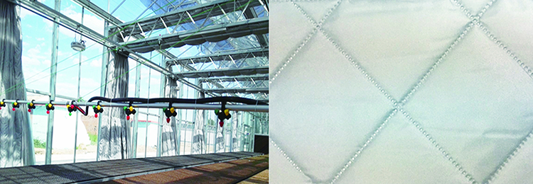 智能溫室內(nèi)保溫被簾采用兩層化纖面料經(jīng)單面涂銀處理,中間保溫層采用120克好質(zhì)量棉加工而成,成品重量為220克,幅寬4.3米,長(zhǎng)度可定制。