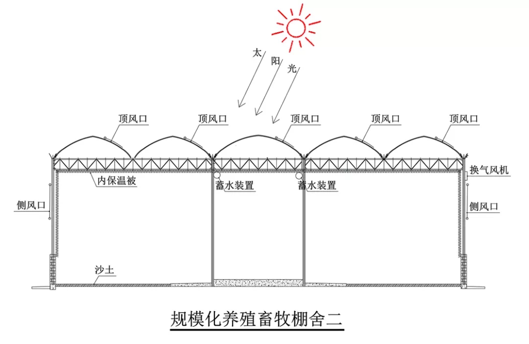 進行畜牧養(yǎng)殖的溫室稱為畜牧養(yǎng)殖溫室。配備智能控制系統(tǒng)的畜牧棚舍稱為智能保溫陽光畜牧棚舍。棚舍(內(nèi)蒙古畜牧棚舍)整體采用鋼架結構,輕便耐用;四周及頂部薄膜覆蓋;后墻及頂部后坡整體覆蓋毛氈型保溫被;頂部及四周設置通風口;棚舍內(nèi)部在頂部及四周有保溫被;桁架上方設置接滴露薄膜及導流槽;內(nèi)部設置一地下水池,供牛羊飲水。為節(jié)約投資可連棟使用。特別適用于大型畜牧養(yǎng)殖企業(yè),單棟適用于大跨度不同禽類的單獨養(yǎng)殖。