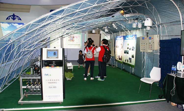 在展區(qū)中間,一座名為“新型裝配式內(nèi)保溫日光溫室&陽光畜牧棚舍”格外引人注目。這個外表是蔬菜暖棚的龐然大物,里面設置了LED智能顯示器、智能放風和卷簾控制系統(tǒng)、營養(yǎng)液施肥機,還擺放著無土栽培綠色蔬菜樣品供觀眾觀賞。