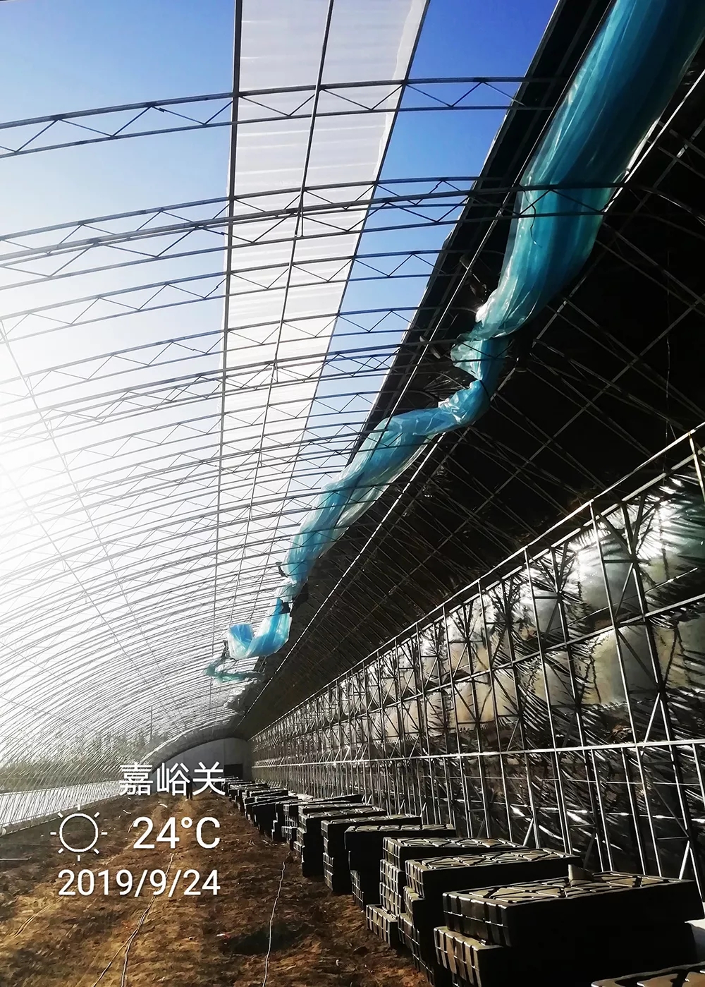 為深入實施鄉(xiāng)村振興戰(zhàn)略,促進(jìn)農(nóng)民持續(xù)增收以及全力推進(jìn)嘉峪關(guān)設(shè)施農(nóng)業(yè)發(fā)展進(jìn)程,2019年,嘉峪關(guān)市政府引進(jìn)內(nèi)蒙古農(nóng)業(yè)大學(xué)與內(nèi)蒙古中天科技有限公司聯(lián)合研發(fā)的“水蓄熱雙膜內(nèi)保溫裝配式日光溫室”新技術(shù),在嘉峪關(guān)市城關(guān)鎮(zhèn)新城村建設(shè)4棟高標(biāo)準(zhǔn)水蓄熱雙膜內(nèi)保溫裝配式日光溫室,占地面積約20畝,建筑面積約為10畝(溫室規(guī)格:長度為135米,跨度為12米,脊高6.1米)。